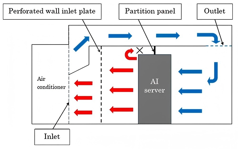 The air circulation system in the test area includes ducts in the ceiling with outlets positioned at the AI server inlet area, as well as partition panels separating the front and rear server zones. This design prevents recirculation of server exhaust heat, ensuring a uniform inlet temperature distribution and enabling testing compliant with applicable test standards. The perforated panels across the entire wall surface at the air-conditioning inlet also allow efficient recovery of exhaust heat while preventing accumulation in the test area.