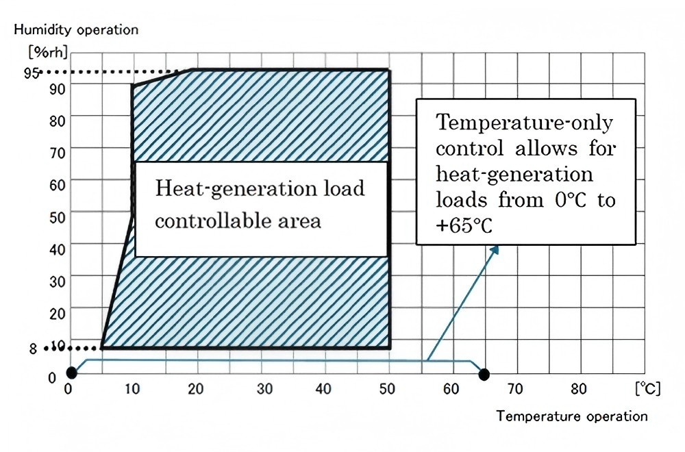 Use of standard air-conditioning systems is possible with the addition of a hot-water cooler to the existing air-conditioning system, thereby reducing the overall refrigeration equipment capacity even for high heat-generating test specimens such as AI servers. As a result, the system achieves greater energy savings and a compact footprint even with support for high heat-generation loads (patent pending).